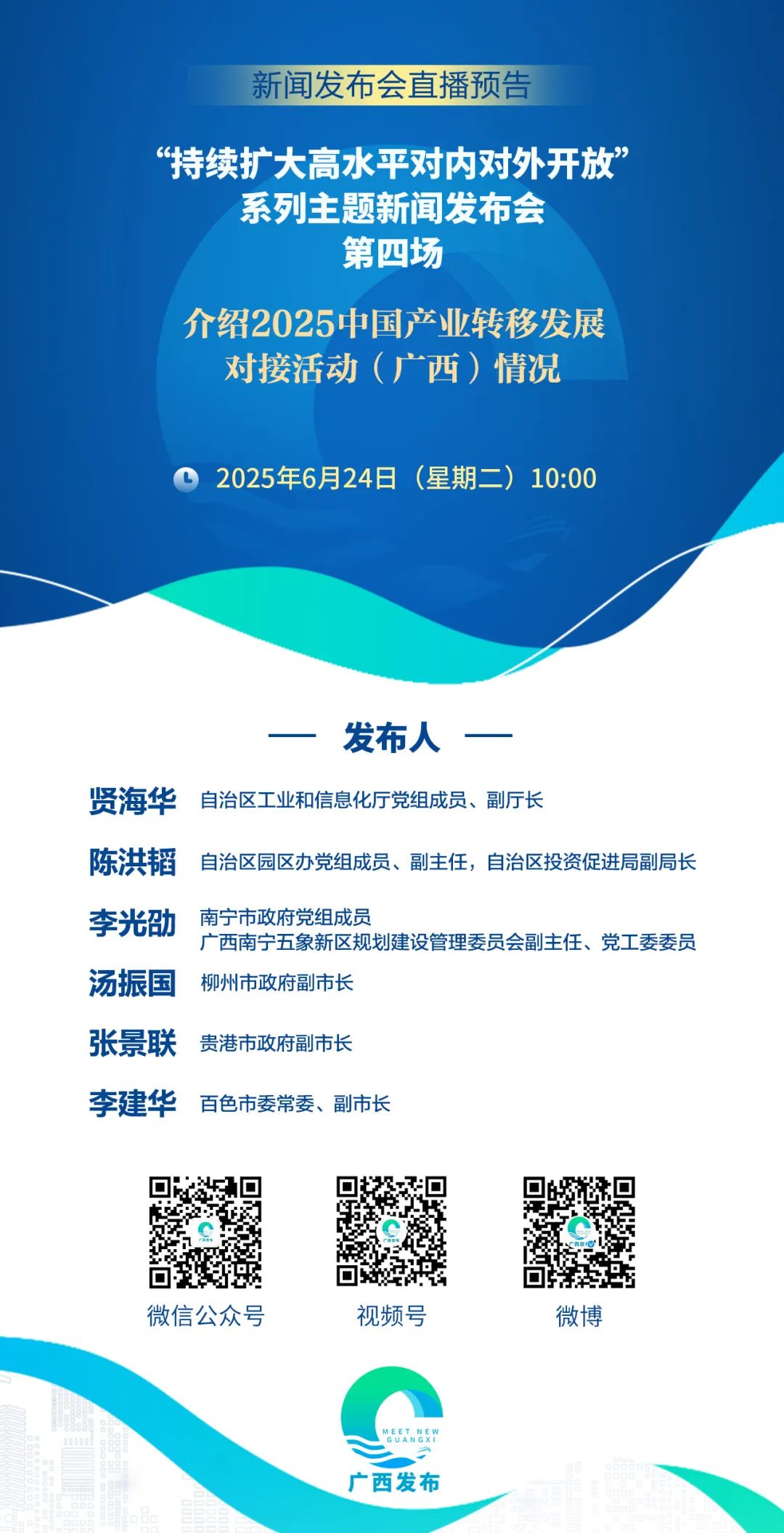 广西壮族自治区人民政府新闻办公室将于2025年6月24日(星期二)10:00,在广西新闻发布厅举行“持续扩大高水平对内对外开放”系列主题新闻发布会(第四场),邀请自治区工业和信息化厅党组成员、副厅长贤海华;自治区园区办党组成员、副主任,自治区投资促进局副局长陈洪韬;南宁市政府党组成员,广西南宁五象新区规划建设管理委员会副主任、党工委委员李光劭;柳州市政府副市长汤振国;贵港市政府副市长张景联;百色市委常委、副市长李建华,介绍2025中国产业转移发展对接活动(广西)情况并回答记者提问。欢迎媒体记者出席。