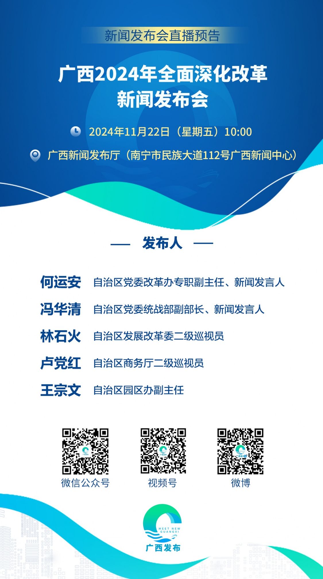 广西壮族自治区人民政府新闻办公室将于2024年11月22日(星期五)10:00,在广西新闻发布厅举行新闻发布会,邀请自治区党委改革办专职副主任、新闻发言人何运安,自治区党委统战部副部长、新闻发言人冯华清,自治区发展改革委二级巡视员林石火,自治区商务厅二级巡视员卢党红,自治区园区办副主任王宗文,介绍广西2024年全面深化改革有关情况并回答记者提问。欢迎媒体记者出席。
