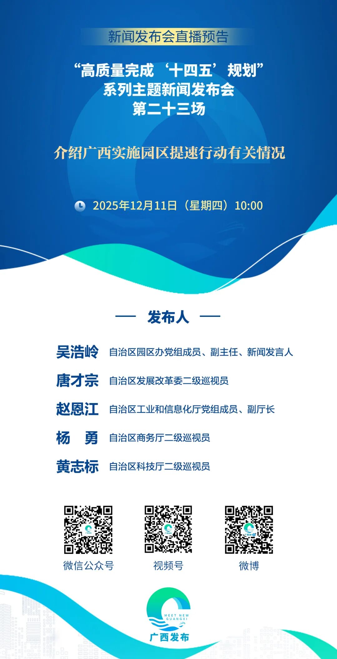 广西壮族自治区人民政府新闻办公室将于2025年12月11日(星期四)10:00,在广西新闻发布厅举行“高质量完成‘十四五’规划”系列主题新闻发布会(第二十三场),邀请自治区园区办党组成员、副主任(正厅级)、新闻发言人吴浩岭,自治区发展改革委二级巡视员唐才宗,自治区工业和信息化厅党组成员、副厅长赵恩江,自治区商务厅二级巡视员杨勇,自治区科技厅二级巡视员黄志标,介绍广西实施园区提速行动有关情况并回答记者提问。欢迎媒体记者出席。