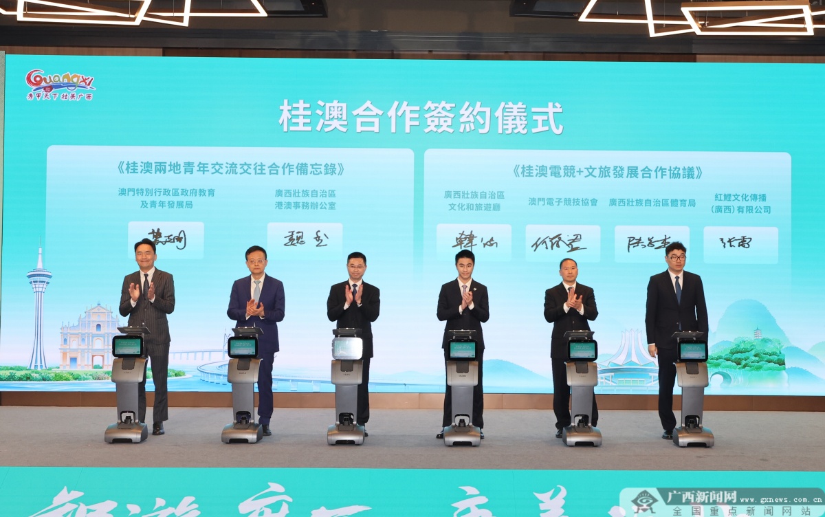 推介会上还举行项目签约仪式,在陈刚、柯岚共同见证下,自治区有关部门、企业分别与澳门特区政府代表、相关行业协会和企业代表签署《桂澳两地青年交流交往合作备忘录》《桂澳电竞+文旅发展合作协议》等多项合作协议,内容涵盖青年交流、电竞文旅、客源互送、产业创新、旅居康养等领域。推介会前,陈刚、柯岚等与会领导嘉宾还参观了“广西康养福地”展示区。