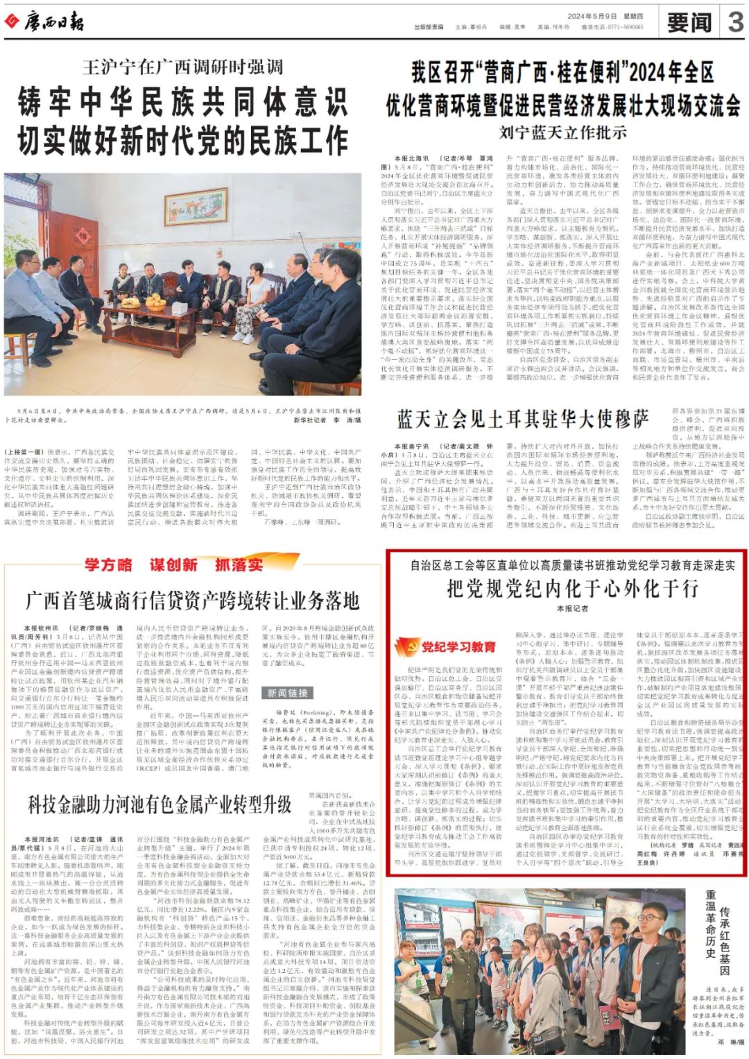 5月9日,广西日报刊发文章《把党规党纪内化于心外化于行丨自治区总工会等区直单位以高质量读书班推动党纪学习教育走深走实》,报道自治区园区办举办党纪学习教育读书班暨理论学习中心组集中学习情况,现摘要如下: