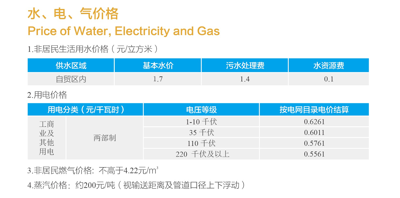 园区水、电、气和蒸汽供应都较充足,价格如下所示。