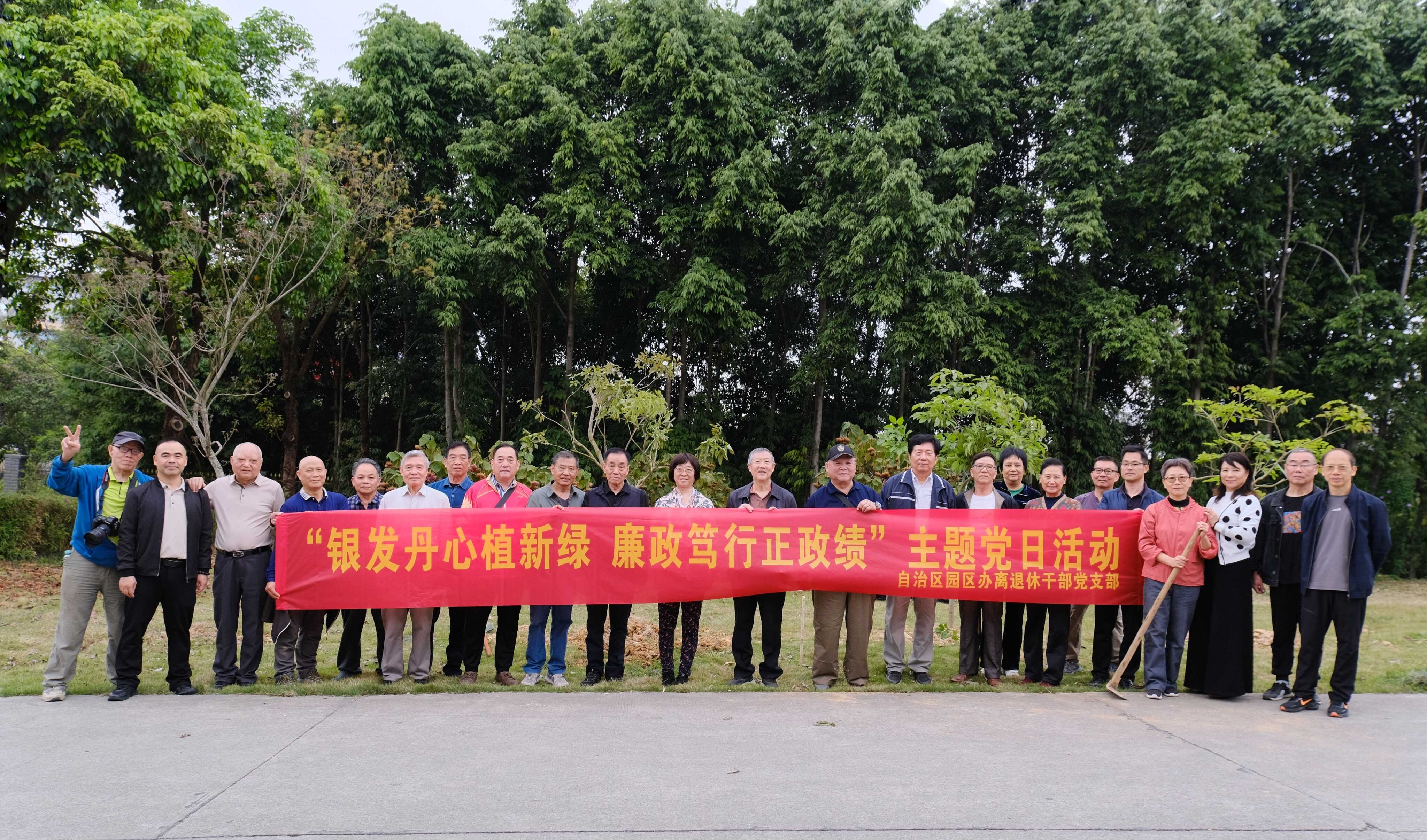 为深入贯彻落实党中央关于树立和践行正确政绩观的决策部署,持续加强退休老干部思想政治引领,筑牢廉洁自律思想防线,践行绿色发展理念,近日,自治区园区办组织离退休干部党支部开展“银发丹心植新绿 廉政笃行正政绩”主题党日活动。活动通过主题教育动员、廉政教育、义务植树三位一体的形式,推动主题教育走深走实,引导老同志们离岗不离党、退休不褪色,以银发余热为事业发展添砖加瓦。