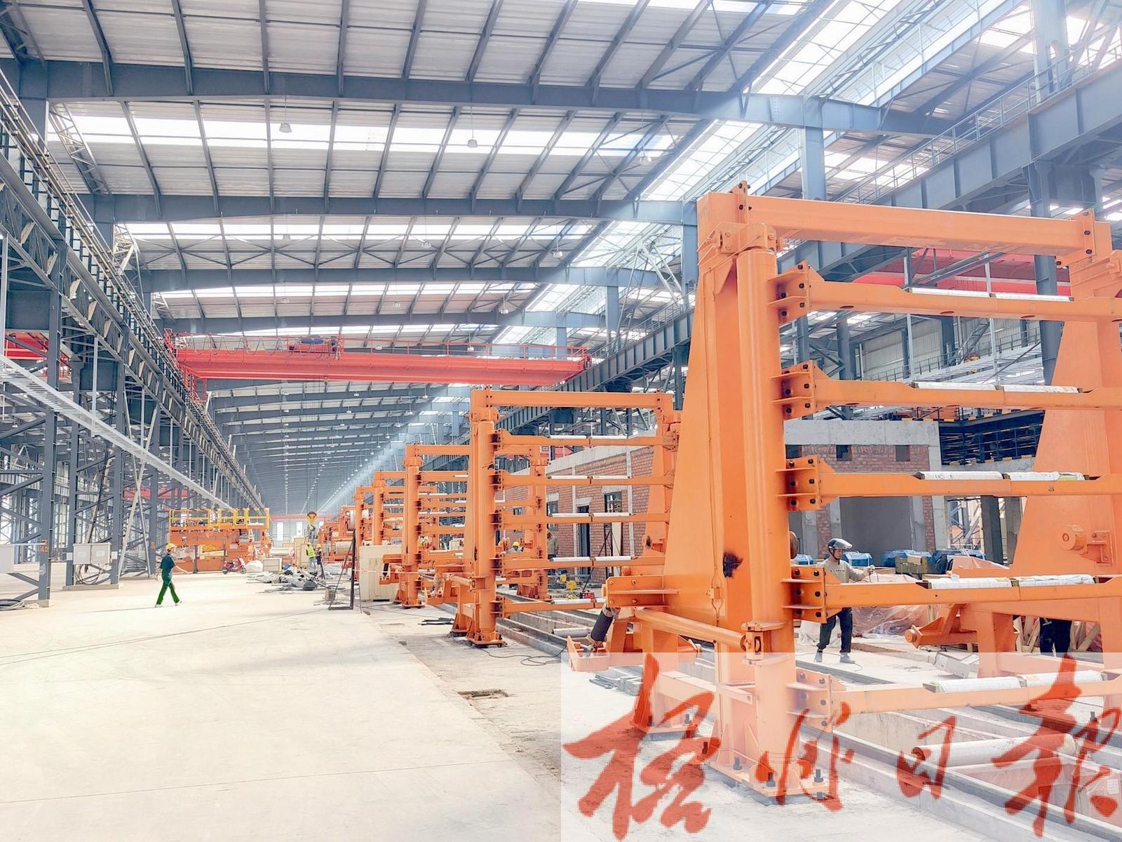 6月11日,在广西弘毅新材料有限公司新建厂房内,工人正在安装生产设备。