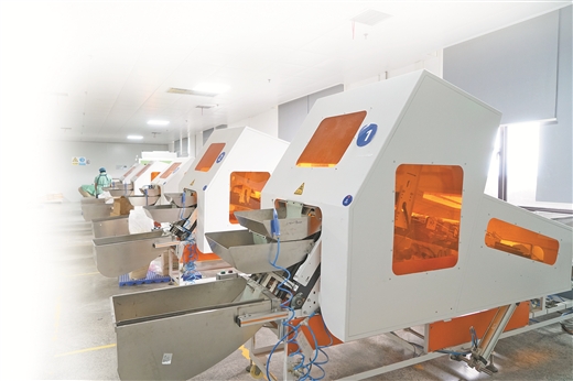 唐潮集团生产车间,自动化设备正在自动筛选竹签。