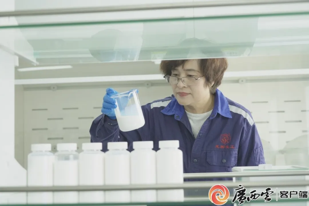 工作人员正在仔细检验丁苯胶乳产品。记者 覃鸿图 摄