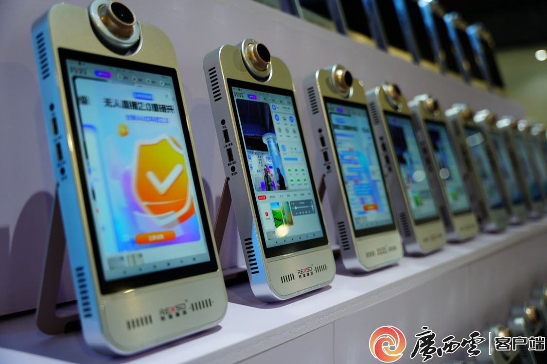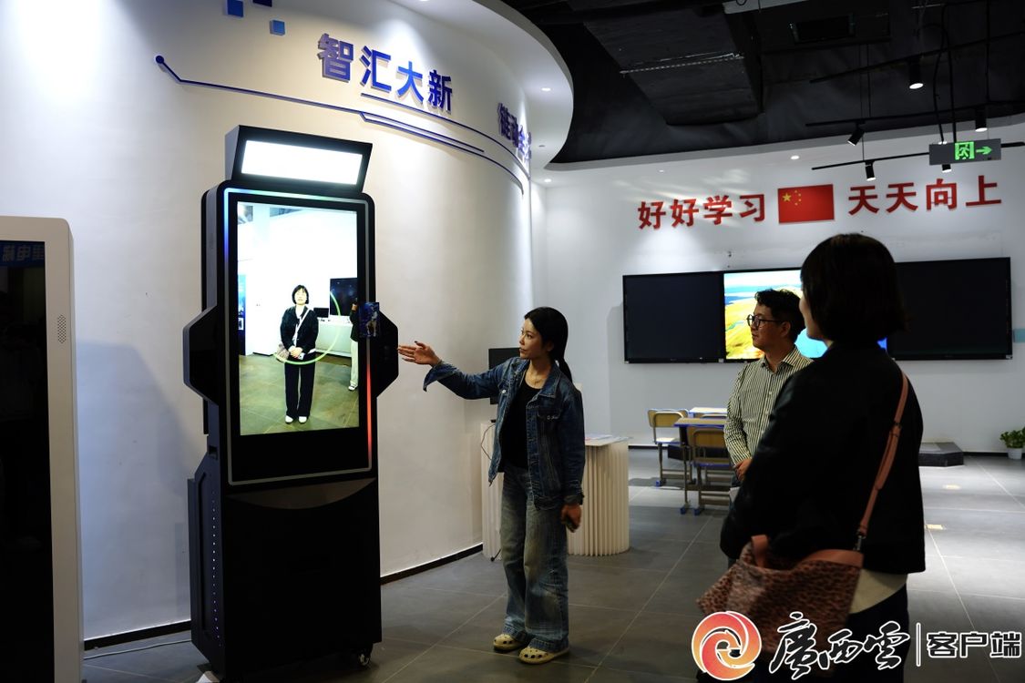 沿着园区主干道前行,广西冠成电子有限公司的现代化厂房格外醒目。在产品展示区,超薄便携显示器、高清商用广告机等多元化产品琳琅满目,彰显了企业的研发实力与市场竞争力。最引人注目的是企业最新研发的“寻说AI旅拍穿越机”——只需随手拍一张人像,AI便能快速合成各类景区背景的旅拍美照,新奇的体验瞬间点燃了采风团的热情,大家纷纷驻足围观、上手体验,现场互动氛围十分热烈。