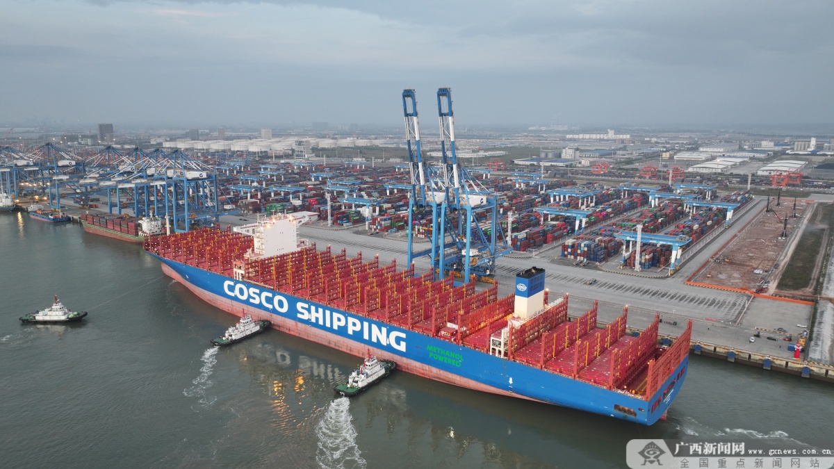 年末,北部湾港货物装卸量增长迅猛。图为一艘巨型集装箱船靠泊北部湾港钦州自动化集装箱码头。 龚百木 摄 来源:广西云-广西日报