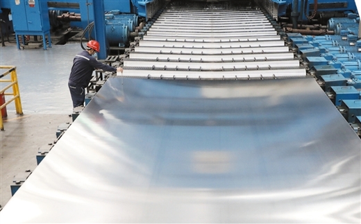 南南铝加工成功研制高韧耐蚀铝合金,成功试产新型铝合金,成功试制超宽幅飞机蒙皮板,突破设备极限的4.04米超宽板实现量产。图为广西南南铝加工有限公司生产车间。
