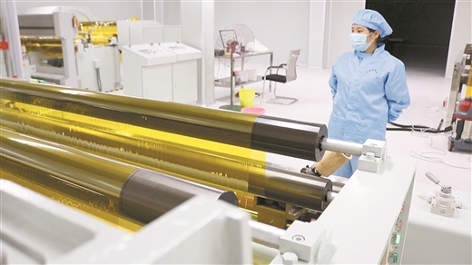 在试验区江南片区,菲玛特公司5条自动化生产线正高速运行,一张张金黄色的聚酰亚胺薄膜不断走下生产线。目前,该公司已形成年产1000吨聚酰亚胺薄膜的产能,其产品应用于柔性线路板、消费电子、高速轨道交通、风力发电、5G通信、航天航空等国家战略性新兴产业领域。2025年1—11月,该公司完成产值2.05亿元,同比增长105.8%。