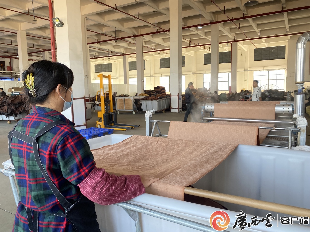 日前,在来宾市象州县石龙镇的三江口节能环保生态产业园内,广西象州新立一实业有限公司的生产车间内蒸腾着热气。伴随着机器的轰鸣声,工人们将一车车布料进行染色、洗毛、定型、预缩和质检等工艺处理,一派繁忙场景。