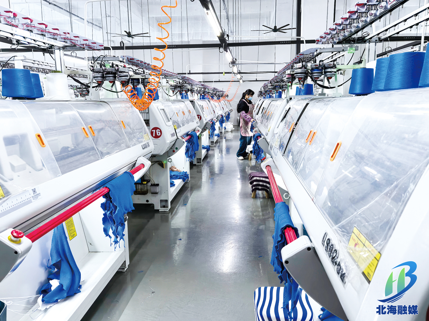 近日,在广西北海钦晨服饰有限公司(以下简称钦晨服饰)的智能化生产车间里,全自动织片机正高速运转,一片片立体针织面料如流水般滑落,工人一边察看机器运行状态一边收集成品面料;在其他作业区,工人通过操作机器,对毛衣原料进行加工处理作业,对毛衣产品开展光照质检……整个生产线作业有条不紊。