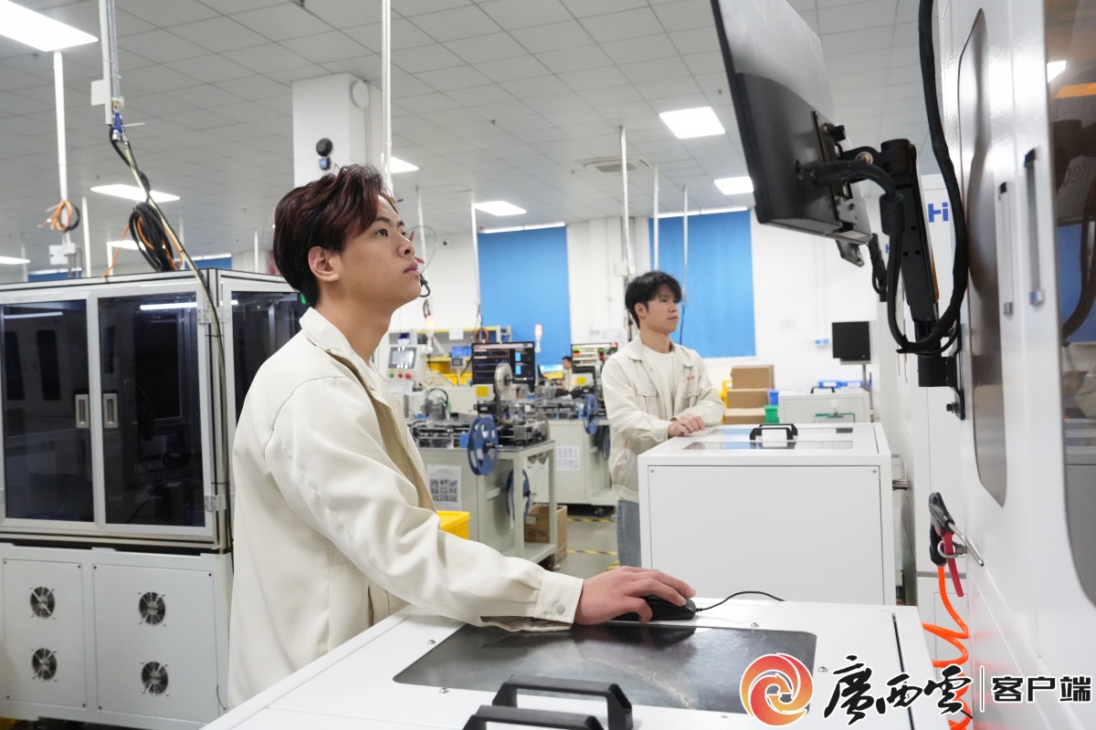 在广西创马优电子技术开发有限公司生产车间,工人正在调试测试设备。雷坤金 摄